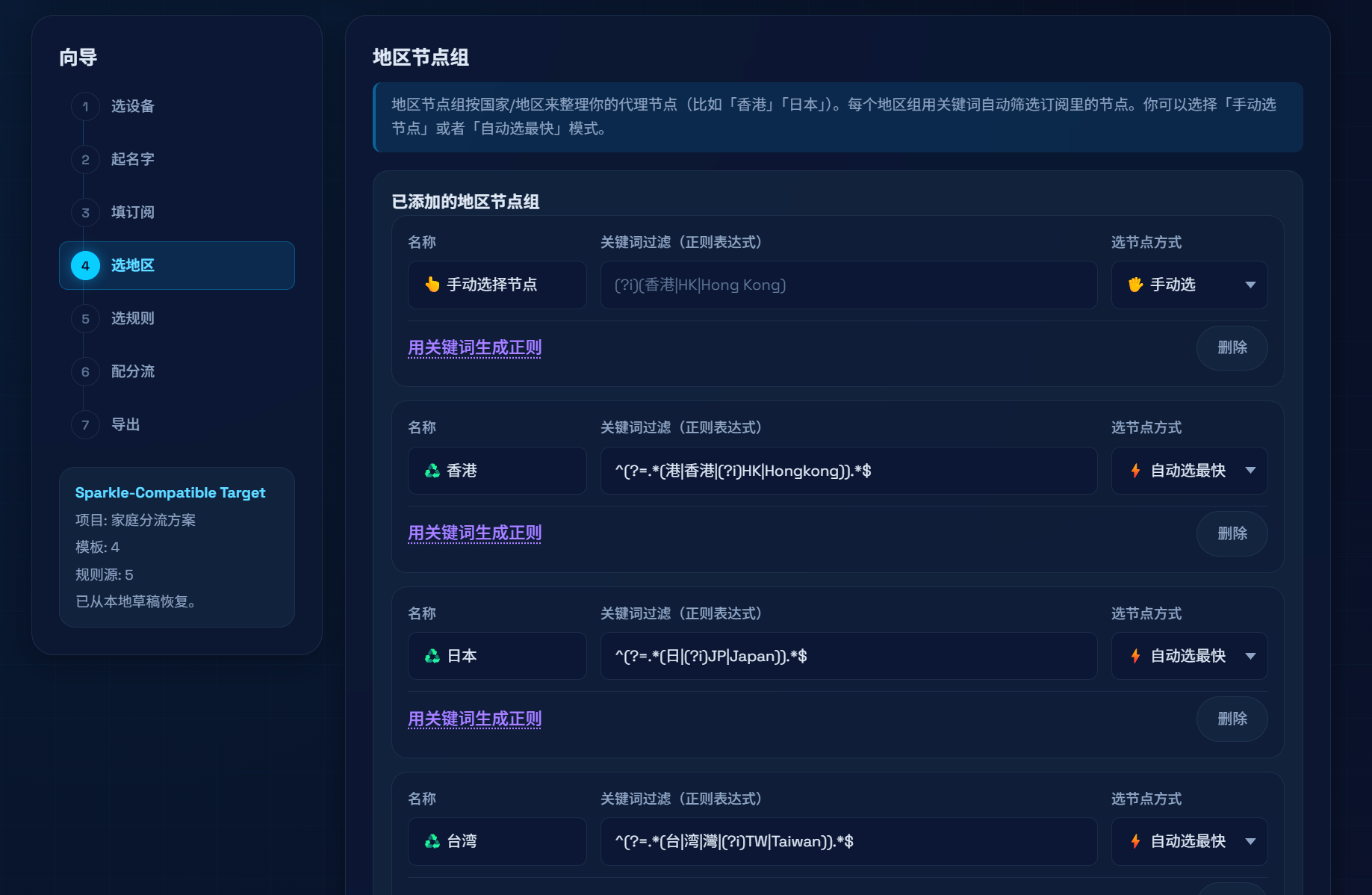 用「包含 / 排除关键词」生成常见 lookahead 写法,降低地区筛节点名的门槛。工程化能力