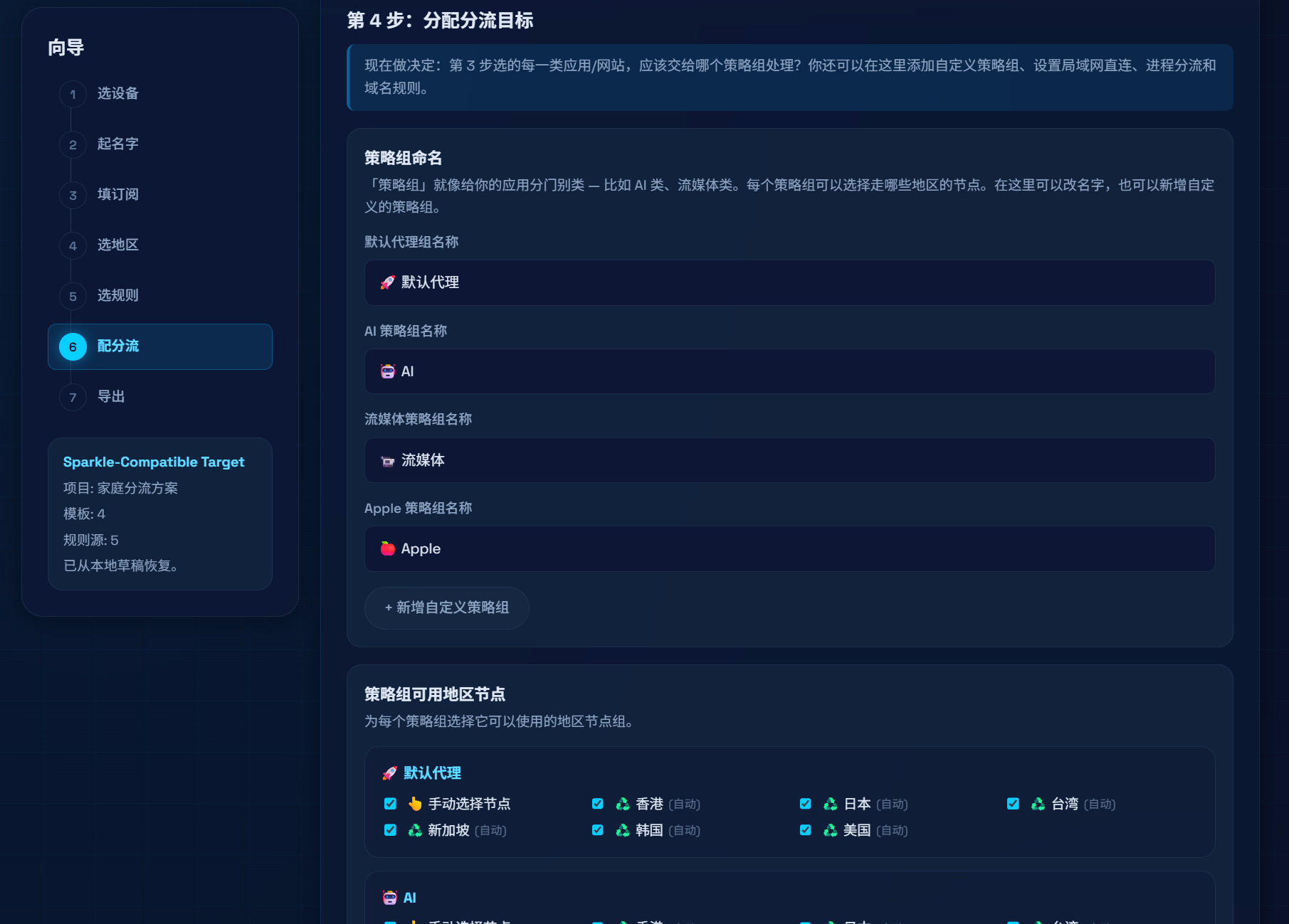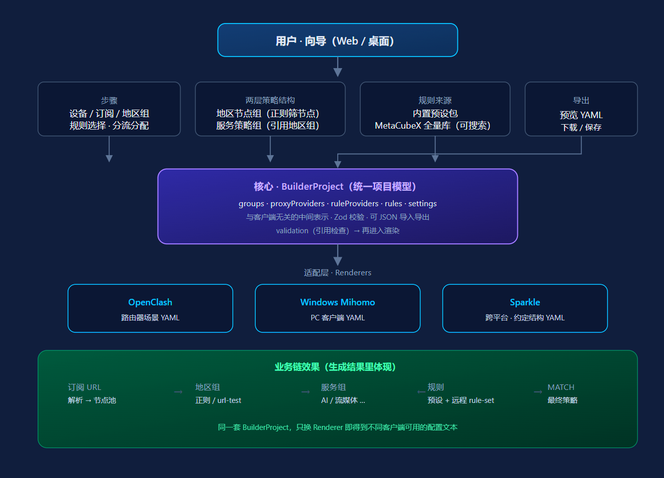 所以我想把问题倒过来:先让用户用向导说清楚「怎么分流」,再由程序生成对应平台能吃的配置。项目定位就是:把「我想怎么分流」稳定地变成「OpenClash / Mihomo / Sparkle 能直接用的 YAML」,并对小白尽量向导化,对以后加平台尽量不推倒重来。
