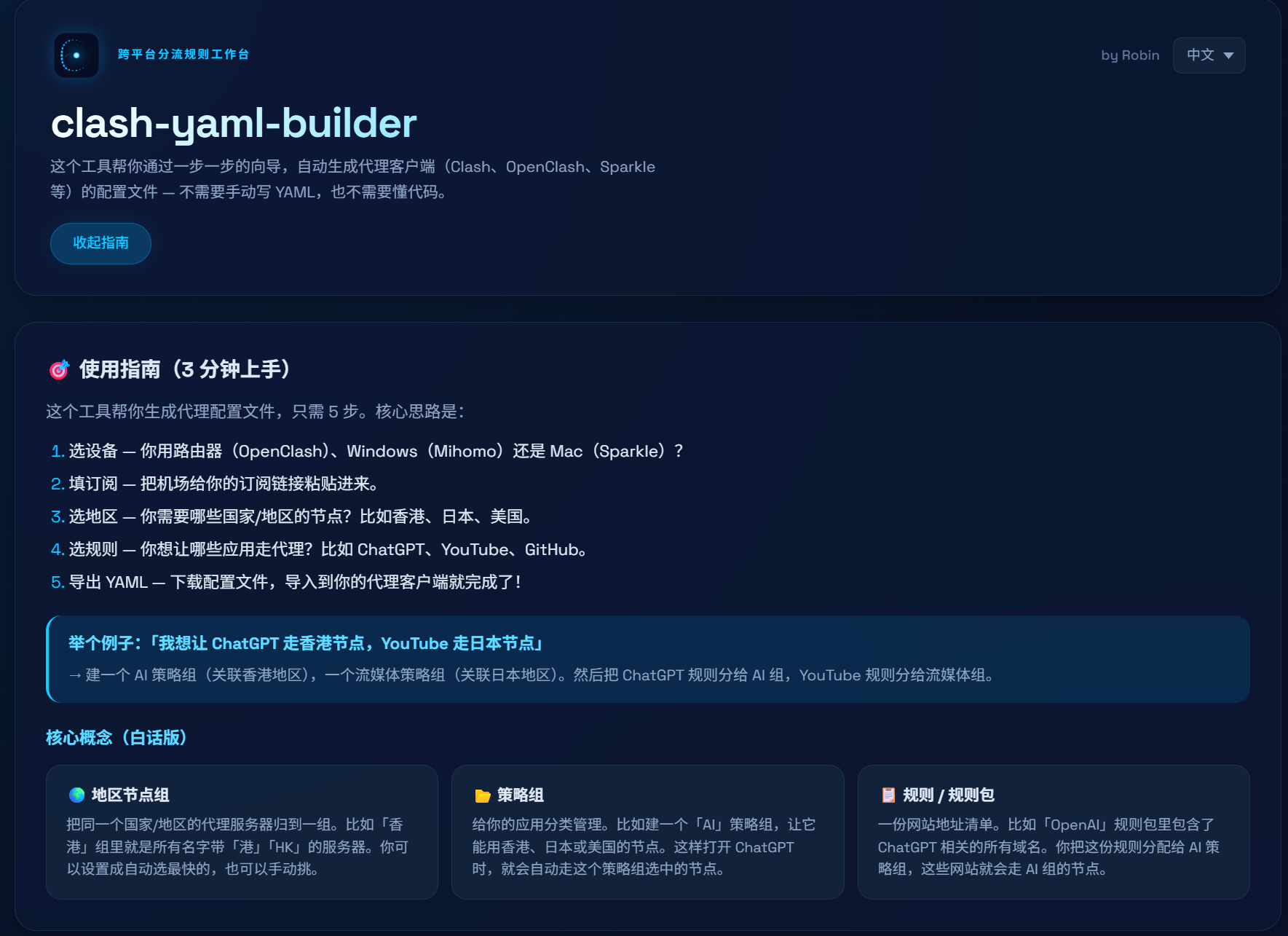 适合:愿意点向导、说清楚分流意图,希望少碰裸 YAML 的人;需要同时在路由 / PC / 多客户端间统一思路再分别导出的人。